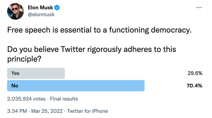 3月下旬,马斯克曾经发布过一条推文要求大家投票,询问大家推特是否严格遵守言论自由原则。他推文写道:“民意调查将带来重大后果。”而在这次调查中,70%的用户称,推特未能坚定贯彻言论自由原则。然后马斯克还回复到,需要一个新平台吗?网友就建议他把推特买了。