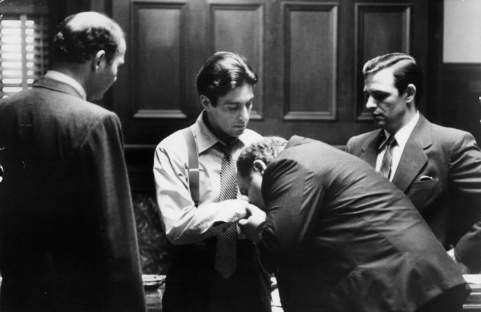 然而命运无解,阿尔·帕西诺逃不掉麦克·柯里昂这个角色。科波拉力排万难,在白兰度的推荐下还是让帕西诺拿到了角色。