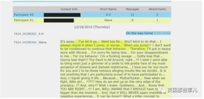 在一条2014年他发给Amber的短信中,德普说自己“太过分”,他说会投入巨大的努力和治疗师配合来解决问题。