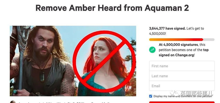 把“Amber从《海王2》中移除”的请愿得到了超过360万的签名。