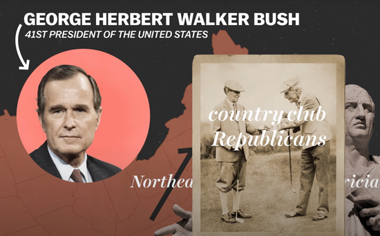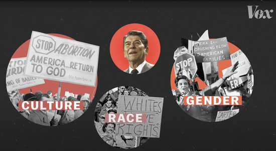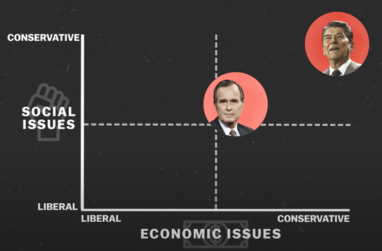 ●上世纪八十年代,老布什与里根分别代表着共和党的不同两翼:前者代表社会议题上更温和的“乡村俱乐部”,后者代表更保守的宗教势力。四十余年后,前者在党内几乎烟消云散,大部分已出走民主党 / Vox