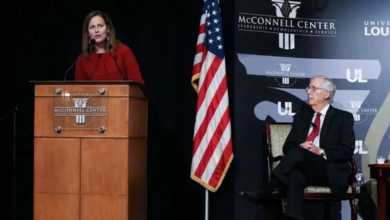 ●2021年9月12日,巴雷特在麦康奈尔中心、以及麦康奈尔身旁演讲,强调高院不是由几个政党分子组成的——或许换其他场合会更有说服力一些 / 网络