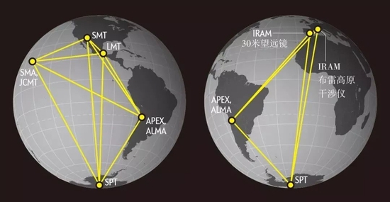 8架射电望远镜或干涉阵参与了此次观测。(图中IRAM布雷高原干涉仪未参与此次观测)每架望远镜都位于高海拔处,以保证地球大气对信号的吸收降到最低。利用全球范围的设备以及在毫米波段进行观测,该天线阵的有效角分辨率将达到数百万分之一角秒——足以看清月球上一张DVD。