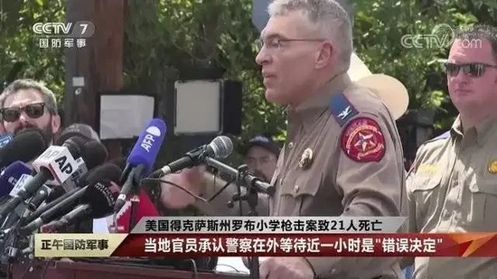 美国得州罗布小学枪击案,得州公共安全局局长麦克劳承认警察在外等待近一小时是“错误决定” 图:央视报道截屏