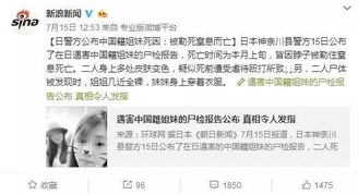 据日本《朝日新闻》7月15日报道,日本神奈川县警方15日公布了在日遇害的中国籍姐妹的尸检报告,二人死亡时间为本月上旬,皆因脖子被勒住窒息死亡。日方公布的尸检报告还表明,二人身上多处皮肤变色,疑似死前遭受虐待殴打所致。