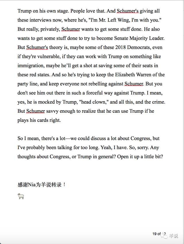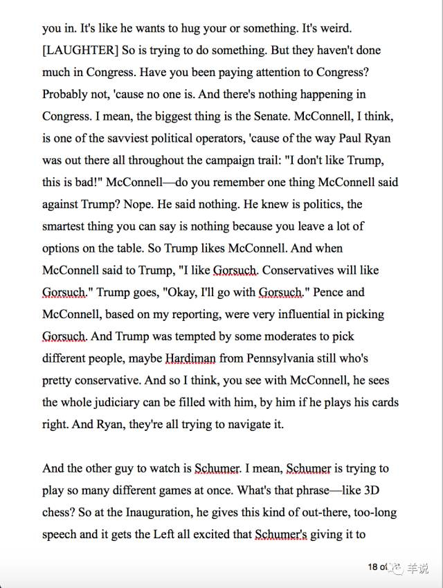 But I still said—here‘s what I thought。 Think about this。 I write for a mainstream newspaper, and I’ve always been just a reporter。 I‘ve never written a com[mentary], never written an editorial。 But I said to myself, “Post 2012, there’s a vacuum inside the Republican Party。 That you got the shutdown of what‘s happening just as Trump was talking in 2013。 You had a leaderless Republican Party in Congress。 The possibility for celebrity populism to take hold, I always thought was not guaranteed, but it was there。 So long story short, Trump runs, he wins, it was the wildest two years of my life。 Travelled around the country, saw everywhere。 I covered Bernie Sanders as well, Secretary Clinton。 But I was always Trump, Trump, Trump。