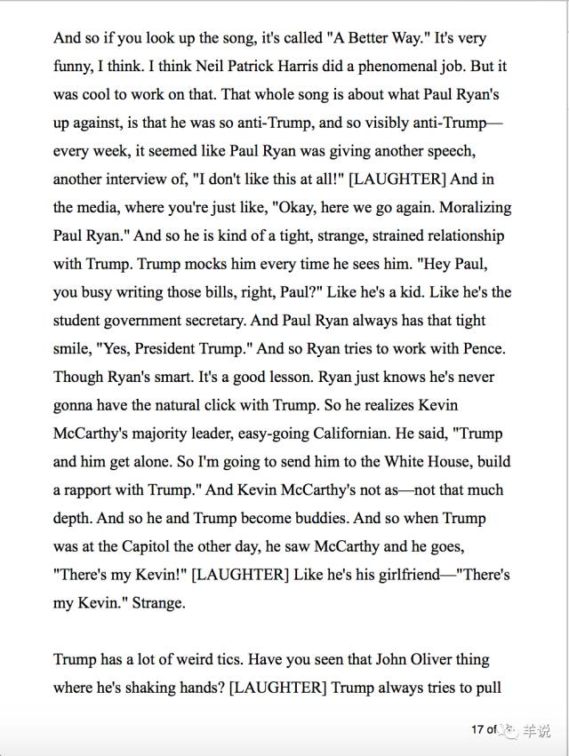 YANG: I don‘t usually talk a lot about him, because, you know, like Tom Friedman said, if you read Trump’s tweets too much, it will suck your brain out。 [LAUGHTER] I always look at what he does, not what he says。