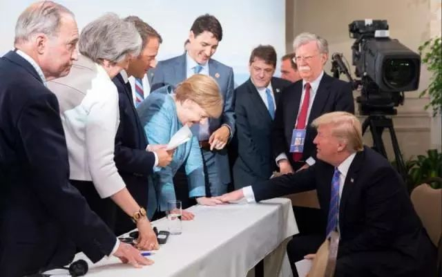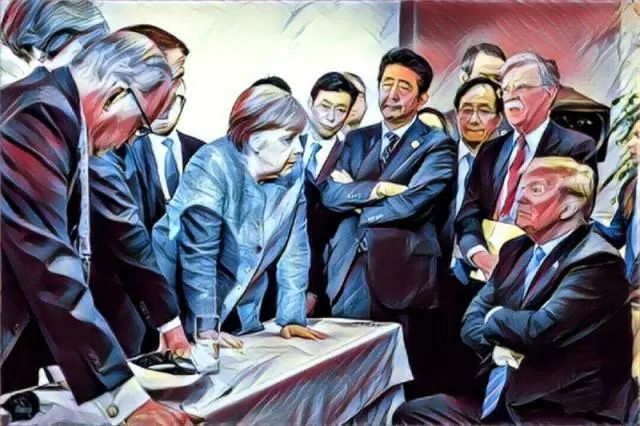 这幅照片上的所有人物都神情并茂,但神情也含糊。例如默克尔是严肃还是愤怒?特朗普是生气还是稳重?周边的安培晋三是木讷还是思考?博尔顿在为特朗普辩解或解围?所以,这张照片可以作出许多解读。