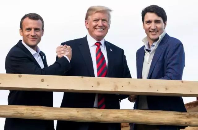 特朗普与法国总统马克龙、加拿大总理贾斯汀·杜魯多友好合影