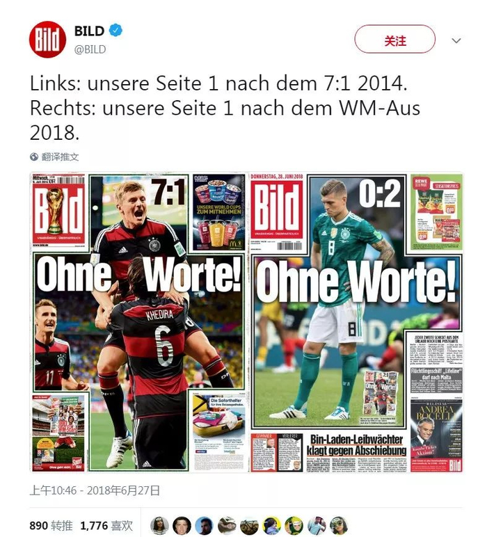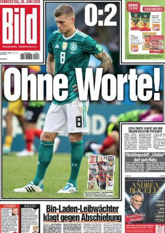 《世界报》(Die Welt)用了两个关键词“Aus und vorbei”(英语:Over and out),“结束,出局”,旁边的配图则是克罗斯掩面沮丧的表情。