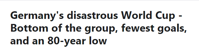 这场比赛后,不少媒体用“disastrous”(灾难性的)、“80-year low”(80年来最差)等词形容德国队。
