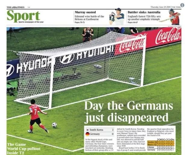 《泰晤士报》在末版报道了德国队出局的消息,配了德国队空门的照片,标题也很应景:“Day the Gremans just disappeared”,“这一天,德国队消失了”。