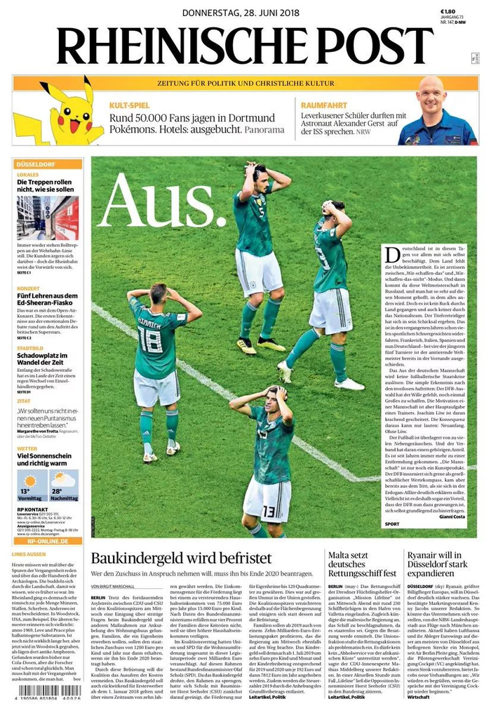 《莱茵邮报》(Rheinische Post)的头条更简洁,只有一个单词:“Aus”(英语:Out),“出局”。