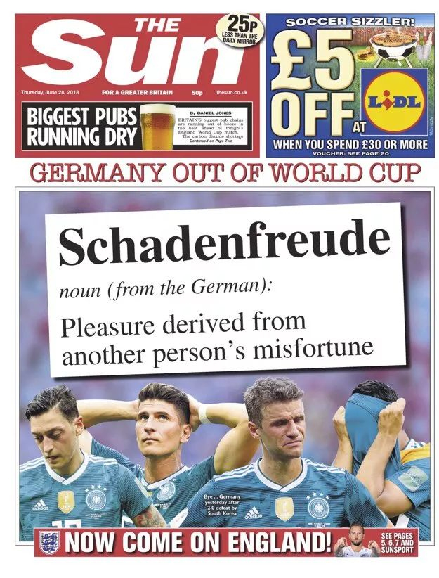 《太阳报》(The Sun)头条用了一个很长的英语单词,Schadenfreude,也就是“幸灾乐祸”的意思。