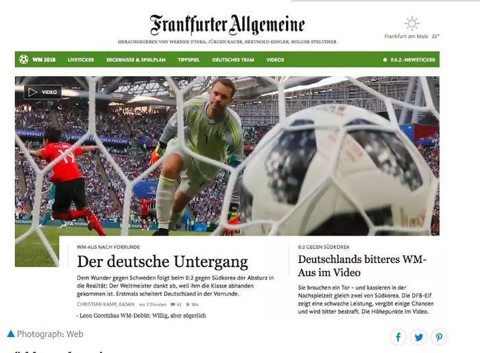 《法兰克福汇报》(Frankfurter Allgemeine)把这场失利称为“Der deutsche Untergang”(英语:Germany’s downfall)“德国队的陨落”,给出的评价是“back to earth with a bump”,意为“重重跌回现实”。
