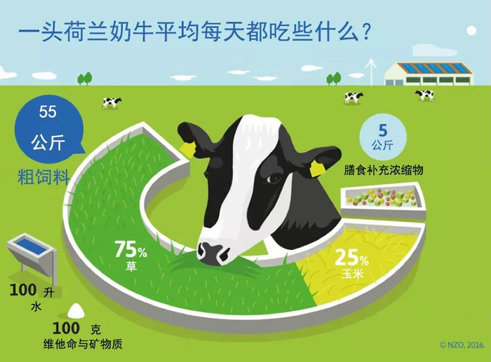 在荷兰,每一头奶牛平均每天会吃掉55公斤的食物,其中有75%的牧草、25%的玉米。除此之外,奶农还会给奶牛喂下约5公斤的膳食补充品,例如大豆蛋白、维生素、矿物质、小麦纤维等补充品来均衡营养。