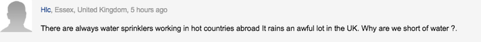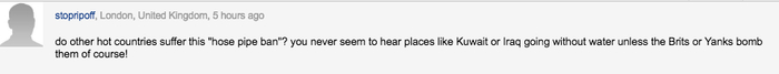 “其他炎热的国家会遭受这种“软管禁令”吗?你似乎从来没有听说过像科威特或伊拉克这样没有水的地方有这种禁令,除非英国或美国轰炸他们!”