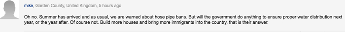 “夏天来了,一如往常,我们被警告要禁止用水管。但是政府会做些什么来保证明年或者明年的水分配吗?当然不是。建造更多的房屋,让更多的移民进入这个国家,这就是他们的答案。”