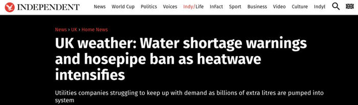 英媒忧心忡忡,由于高温用水需求量太大,尤其是在早上和傍晚,一些地区昨天已经出现了水压不足,在Shropshire、Staffordshire 和 Derbyshire地区甚至已经中断供水。