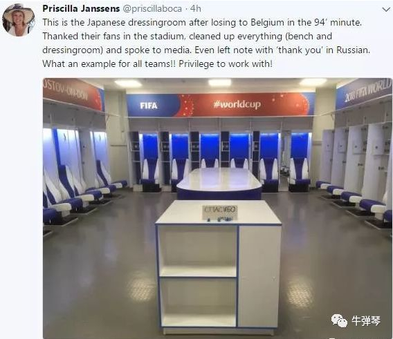 一位国际足联官员,在推特上晒了张日本足球队更衣室的照片,然后配了这样一段文字: