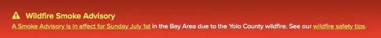 受山火影响,整个旧金山湾区空气质量下降,PM2.5超标,当局发布警告,建议减少户外活动!