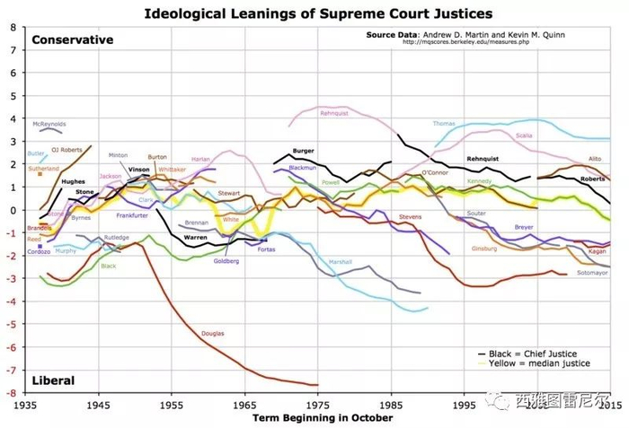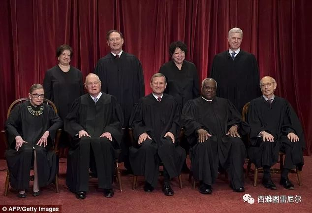 与行政分支的(总统)和立法分支的(参众两院议员)选举产生不同,最高法院九位大法官是由总统提名,经参议院半数通过产生的,终身制!(除非受到国会弹劾),跟选民和民意根本不搭边儿。