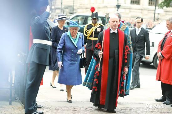 在今天的阅兵和军用飞机表演前,女王穿着一身“王室蓝”,带着王室一大家子先浩浩荡荡来到威斯敏斯特大教堂▼