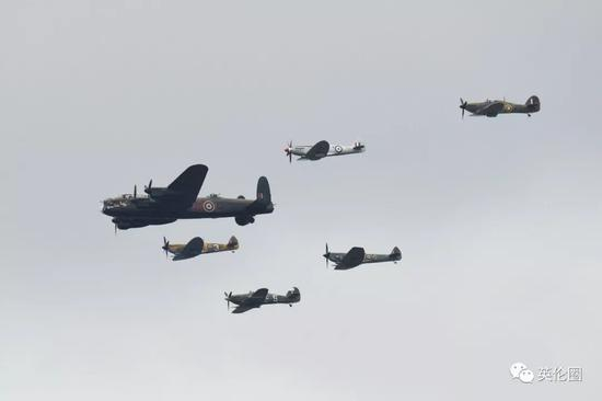 来自二战时期的“兰卡斯特”轰炸机、“喷火”战斗机和“飓风”战斗机并排露面▼