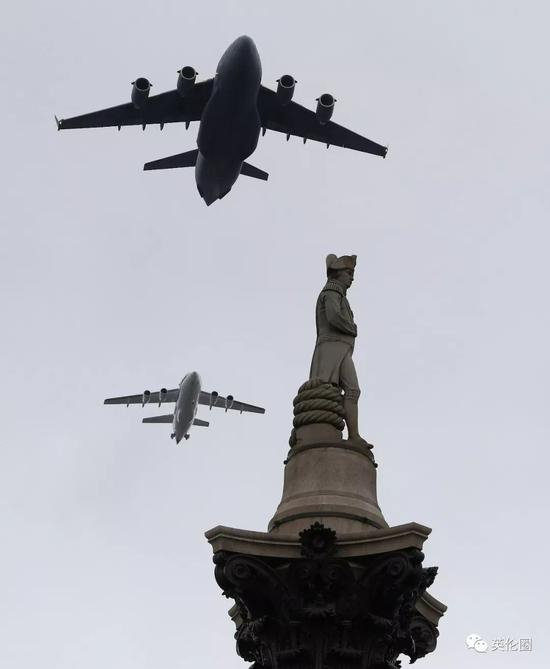 C-17运输机(C-17 Globemaster)飞过特拉法加广场上的尼尔逊雕像▼
