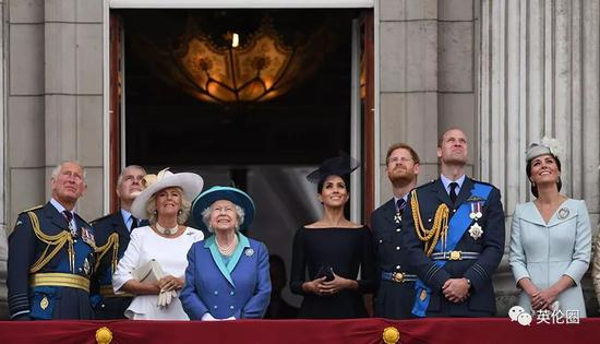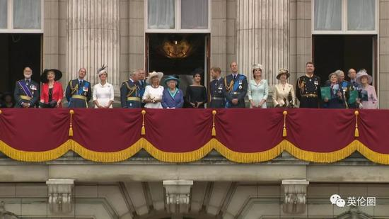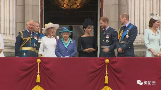 女王带着王室一大家子站在阳台上观礼,连理论上还在休产假的凯特王妃都来了!不过和6月女王生日阅兵不同,这次竟然是梅根站到了女王奶奶身边的C位,和卡米拉平起平坐,凯特和威廉靠边了……