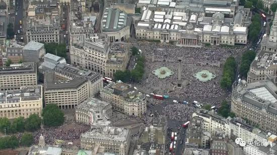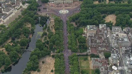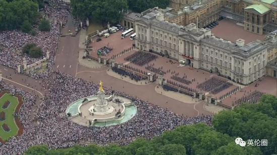 所以也难怪英国人统统挤上街,从白金汉宫门口、到著名的林荫道The Mall、再到林荫道尽头的特拉法加广场,全都挤出了春运即视感……天空新闻说现场估计有几万人同时观礼!你萌自己体会吧▼