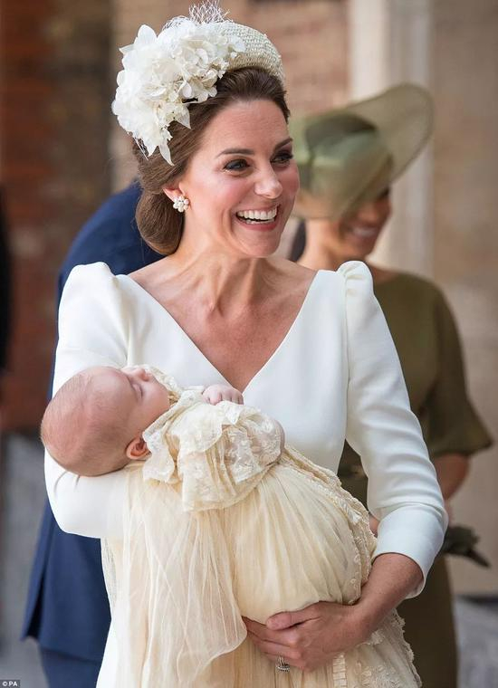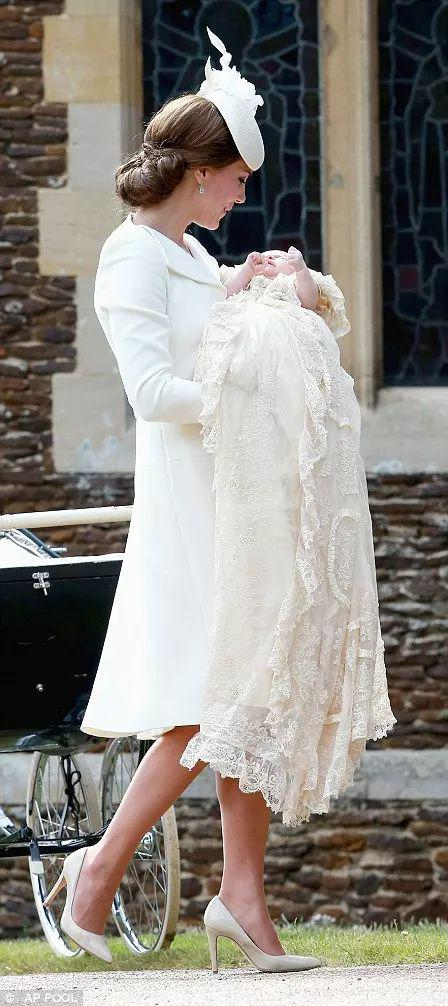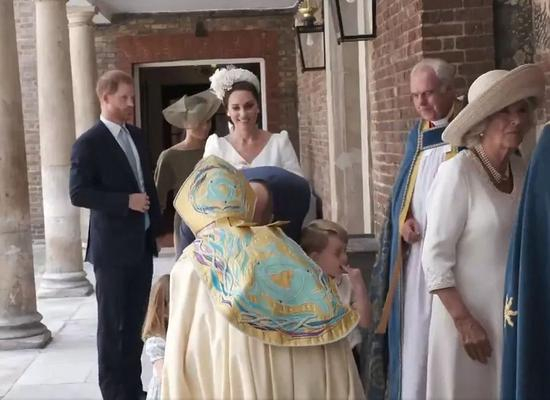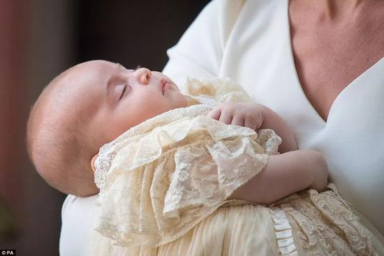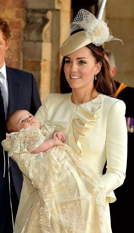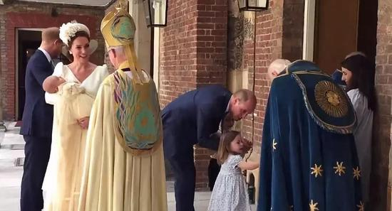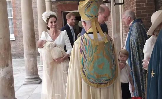 路易小王子穿着的是与哥哥乔治、姐姐夏洛特受洗时相同礼服——1841年维多利亚女王大女儿所穿礼服的复制品,由母亲凯特王妃抱着。