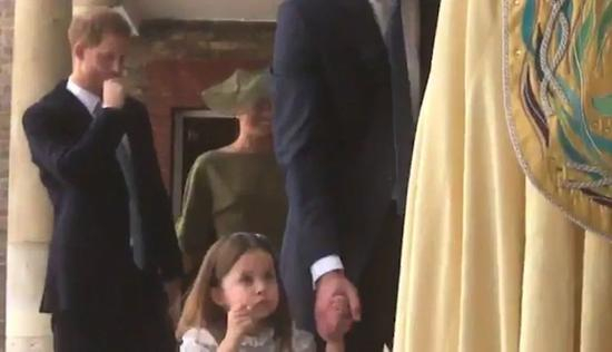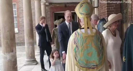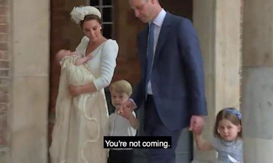 小公主和她的父亲威廉王子手拉手跟着父母走着离开时,看到在外面等着的摄像们,霸气地说:“You‘re not coming”。特别强调了他们没有被邀请来参加自己弟弟的洗礼仪式。