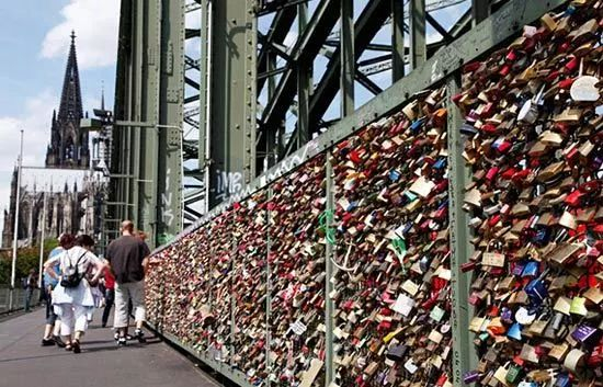 科隆的霍亨索伦桥(Hohenzollernbrücke)上的爱情锁闻名德国,很多情侣在桥梁栏杆悬挂扣上刻有两人名字各式各样的“爱情锁”,甚至有自行车的车锁,象征永恒坚固的爱情。日前,科隆政府决定将霍亨索伦桥上的爱情锁撤去部分,原因是这部分的爱情锁已经危害到桥和行人的安全。