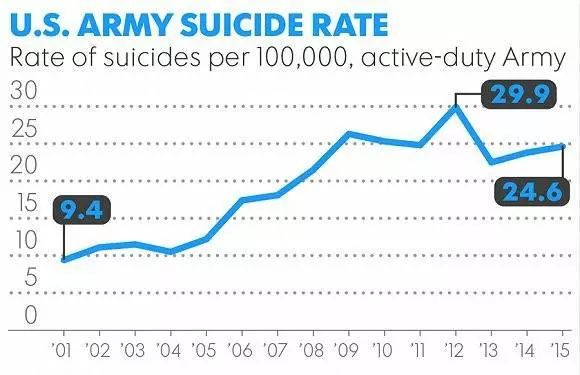 自2009到现在美军的自杀率一直居高不下。据美国《陆军时报》报道,美国陆军平均每10万人里面有20多人自杀,最高峰是2012年,达到了10万分之29.9,在2012年总共有165名陆军人员自杀。但与美国特种部队相比,陆军的自杀率就算啥了。美国四个军种的特种部队总兵力约59000人,但在2012年自杀的官兵却达到了350人,2013年也在284人。美国军方以及民间心理专家都无法解释自杀率为什么会在美军居高不下,如果说参加过伊、阿战争的老兵自杀率高还能理解,但是没有到海外服役的美军人员自杀率也增加了2倍以上,这就令人难以理解了。一些专家将自杀率高的原因归结于入伍时对精神方面的检查不严格,因为统计数据表明,近五分之一的美军人员在入伍前有某种精神疾病,结果就是在美军中有大约8%的军人曾经想过自杀。近年来,美军试图增加心理医生的比例,很大程度上就是为了降低美军人员的自杀率。