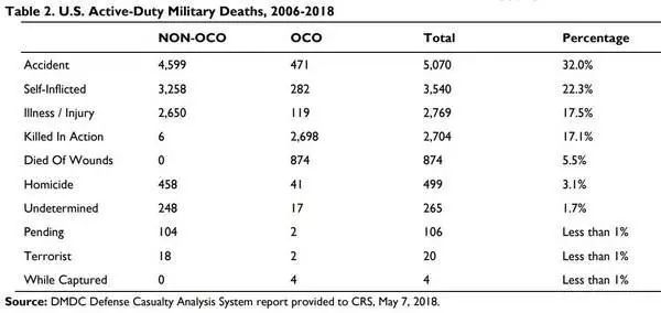 据美国《军事时报》报道,美国科学家联合会日前向公众披露了一份来自国会研究服务处(CRS)的报告。报告显示自 2006 年以来,美军共有15851名现役人员和动员的预备役人员死亡。但是只有28%的死亡原因与打仗有关,72%(具体数字为11341人)的死亡原因都与打仗无关,这说明美军人员即使远离战场仍然面临危险,甚至可以说并不比在战场安全多少。