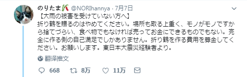 请不要给灾区送千纸鹤了!在储存上很占空间、又不忍心丢弃、既不是食物而且也卖不了钱。这其实只是自我满足而已。请把折千纸鹤的费用当做募资基金吧,拜托各位了。