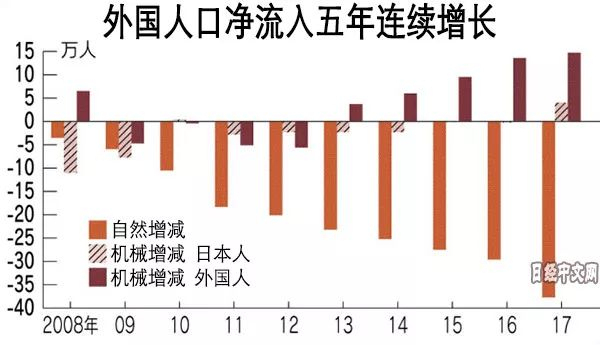 此前, 日本总务省在4月13日曾发布了截至2017年10月1日的人口预测。包括外国人在内的日本总人口比2016年减少22万7千人,降至1亿2670万6千人,连续7年减少。外国人过去1年的净流入人数(入境人数减掉出境人数)创历史新高,达到14万7千人。日本人口加速减少的局面通过外国人的增加获得一定程度缓解的趋势日益鲜明。