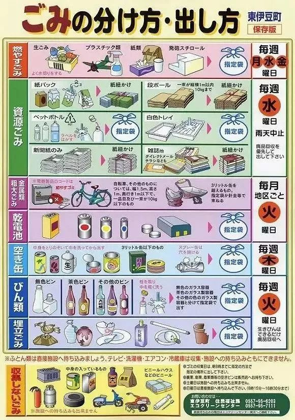 日本每个社区有自己的垃圾分类资料,一般是彩页海报,也有长达几十页的手册。规定了什么是可燃垃圾,不可燃垃圾,粗大垃圾,资源垃圾。每一个大类再细分若干小类,图示了清洗方法,分解方法,捆扎方法,以及粗大垃圾的收费标准,具体到每样物品都有回收价格。