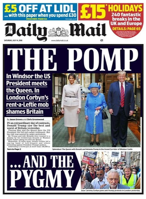 《每日邮报》则将矛头指向工党领袖科尔宾,称他加入伦敦反特朗普游行是“耻辱”。