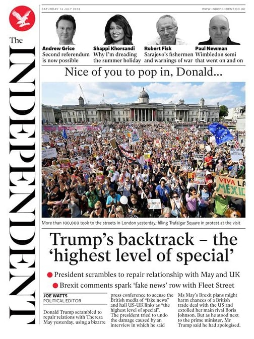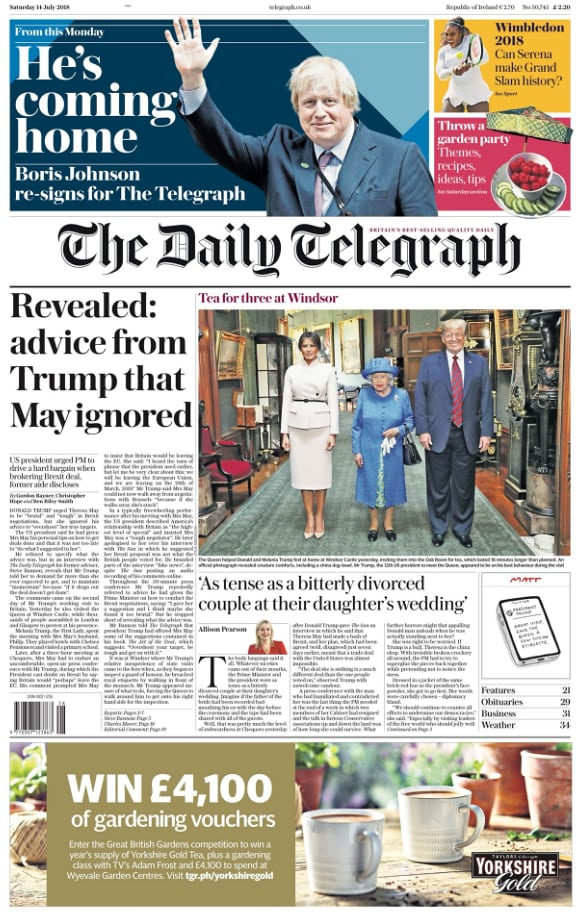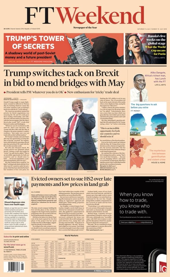 《泰晤士报》则比较冷静地报道了特朗普此行对贸易的影响,“特朗普:我想要贸易协议”,同样冷静的还有《金融时报》,刊登题为“特朗普在脱欧议题上改口,以向特蕾莎示好”的文章。
