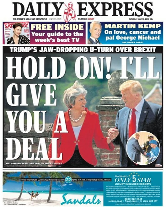 《英国快报》则选用了特蕾莎与特朗普牵手的图片,配文“坚持住!我会给你一个贸易协定的”。