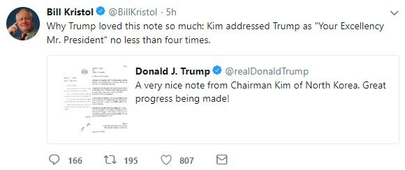 美国《标准周刊》编辑称:“(因为)金正恩在信中至少四次称呼特朗普为‘Your Excellency Mr。 President’(总统先生阁下)”。