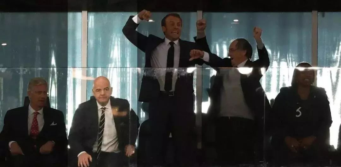 在对战比利时的半决赛中,当法国队进球后,马克龙在高举双臂欢呼庆祝的同时,还不忘同旁边观赛的比利时国王握手。最终法国以1:0战胜比利时,赢得决赛门票。