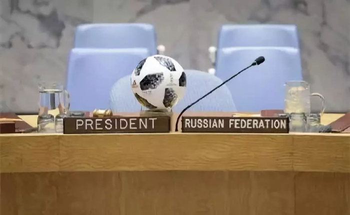 作为安理会轮值主席的俄罗斯似乎已经创造了历史,不但成功地把足球带进了联合国安理会,还在安理会主席的座位前一直摆放着一个足球。