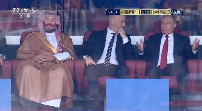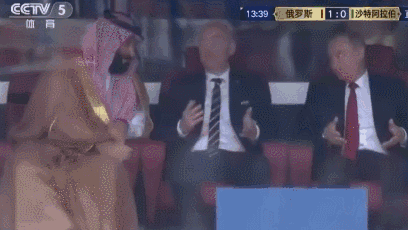 在揭幕战上,普京在俄罗斯队不断扩大比分后的摊手画面也被摄像师捕捉到,成为了当天比赛场外的一大亮点。