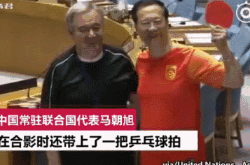 在大家拍摄全家福时,身着典型中国红上衣的中国常驻联合国代表马朝旭突然变戏法似地亮出了一只乒乓球拍,还高高兴兴地拉着涅边贾和联合国秘书长古特雷斯拍照留念,引来一片相机拍照声。