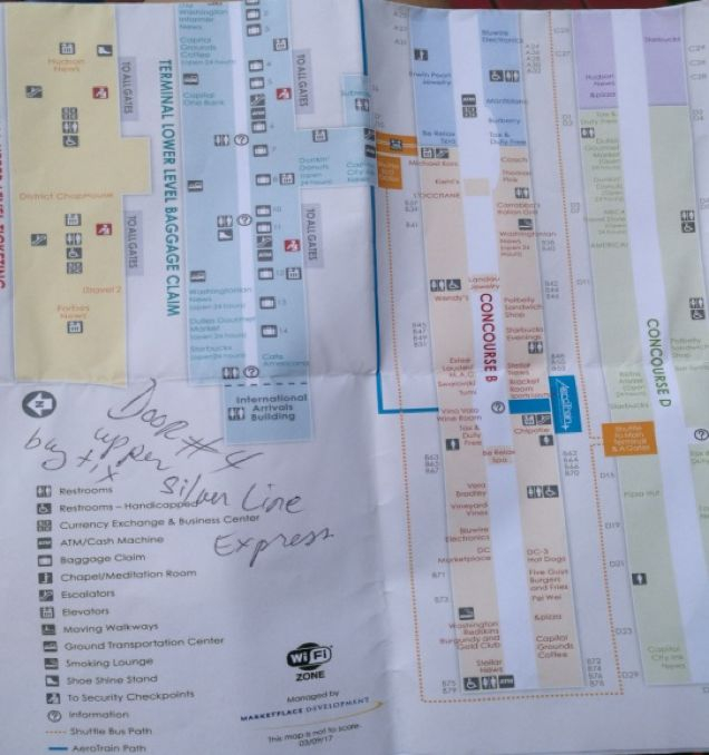 第一站华盛顿特区。在杜勒斯机场一下飞机就面临一个严峻问题,如何到住处?机场远离市区,不通地铁,“优步”软件罢工……当我正晕头转向、不知所措之际,一位志愿者老太太主动问我需要什么帮助吗?知道我想法后,老太太非常详细地指点我怎么坐摆渡车出机场,然后换乘专线巴士到最近地铁站。临别时还不放心,特意送我一张机场地图,并在上面做标记说明。按照她的指示,我真是很顺利地到达了目的地。老太太雪中送炭,让我感激不尽,也让身处异域自带的戒备心减弱不少。临别时送她一句美语“God bless you!”