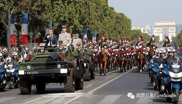 这一天,总统马克龙乘坐一辆战地吉普,缓缓驶过由逾4000名士兵组成的表演矩阵。他温和而庄严——在这样一个重要的场合,他竭力展现出一位世界级领袖该有的姿态——他频频向士兵挥手,飞行队则在空中喷洒出红白蓝的法国三色旗。