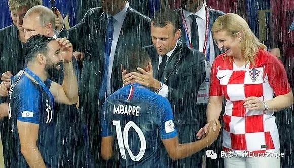 人们不会忘记,决赛的这天,在大雨倾盆的莫斯科卢日尼基体育场,亲赴现场观战的马克龙站在颁奖台上,亲吻了姆巴佩和格里兹曼,又紧紧拥抱了主教练德尚。